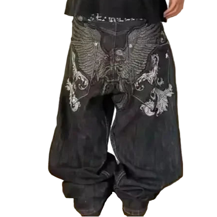 Turn heads with bold Y2K patchwork jeans that blend Gothic edge with high street style.