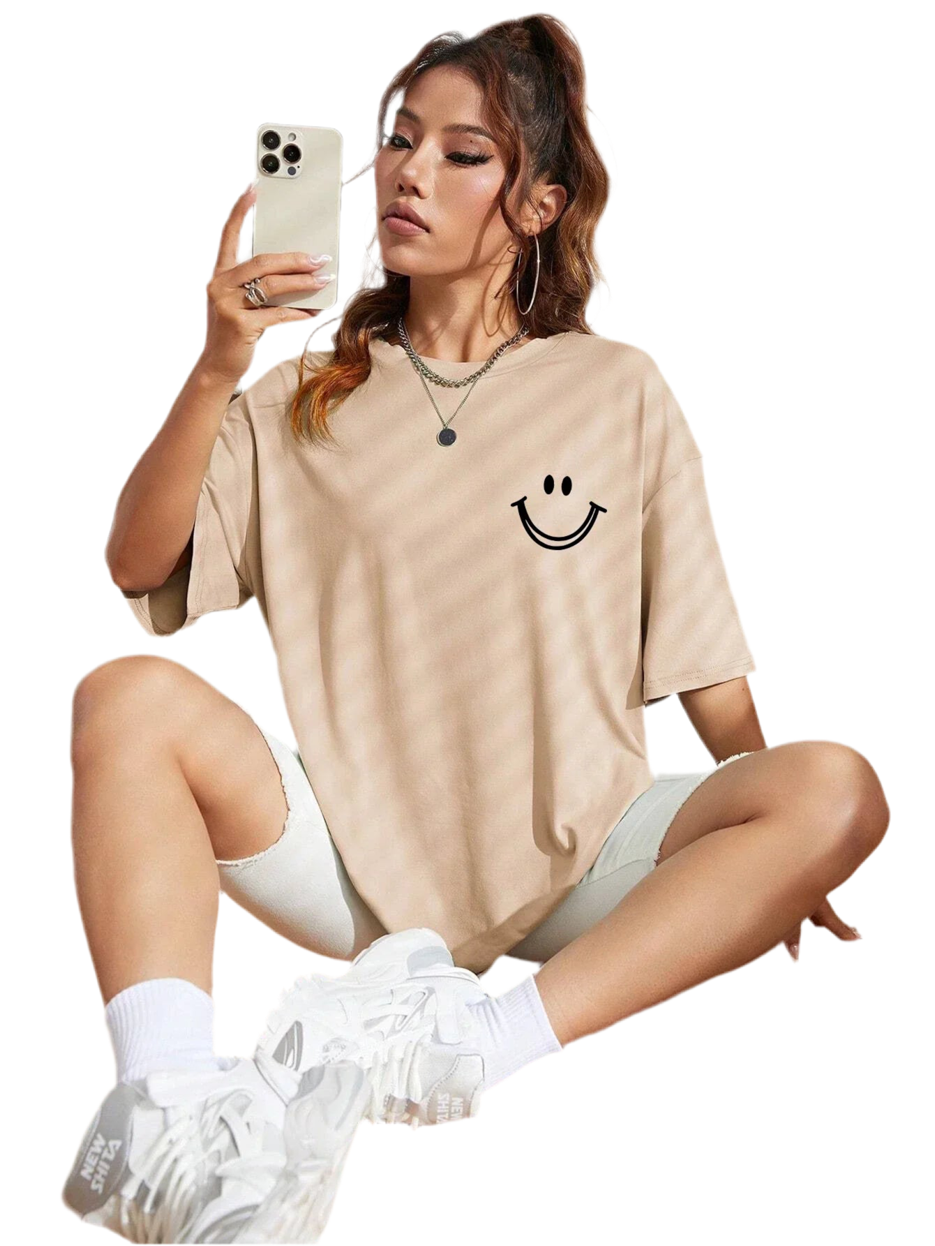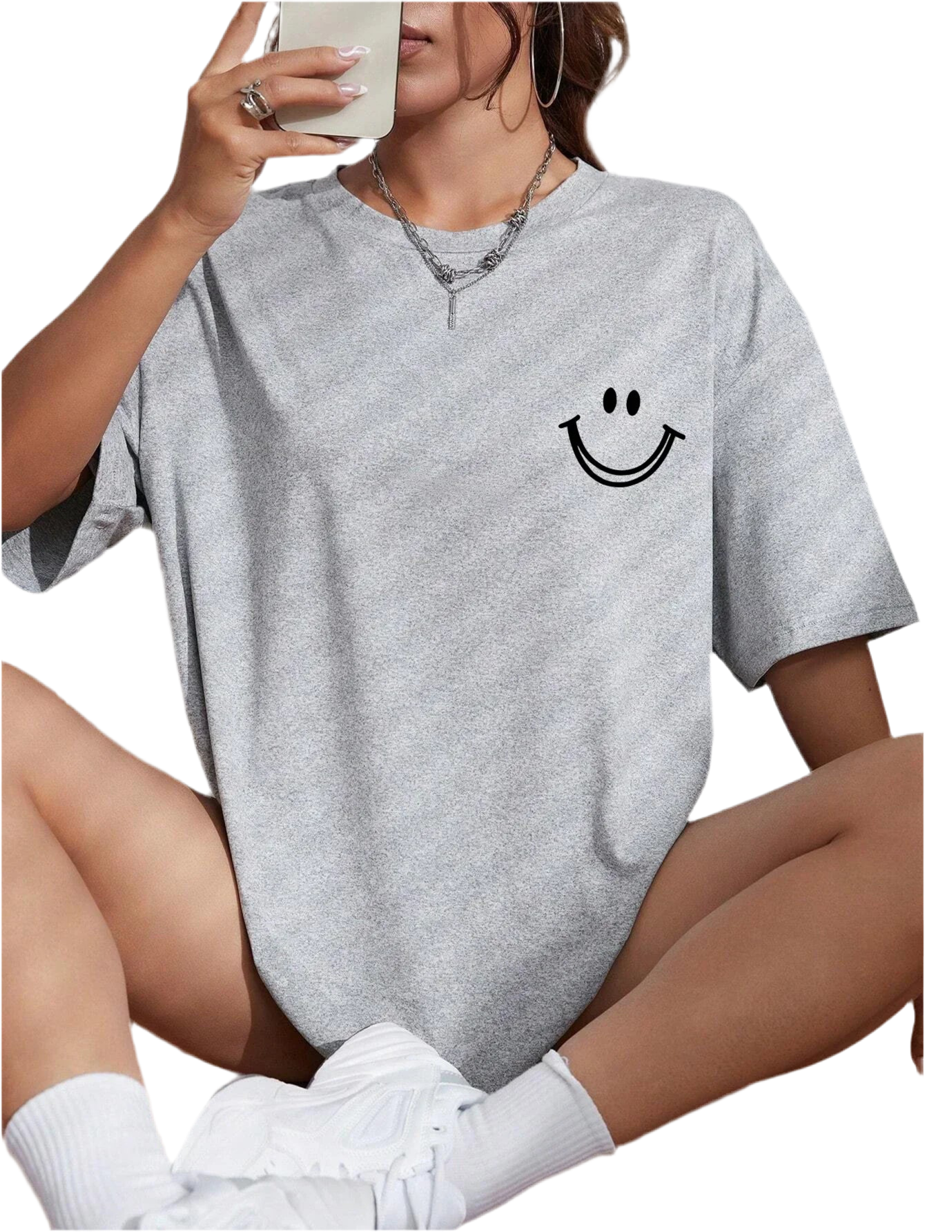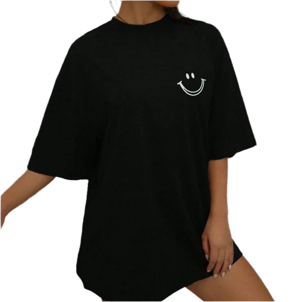 Features a cheerful face graphic that adds a fun, expressive touch to any casual outfit.