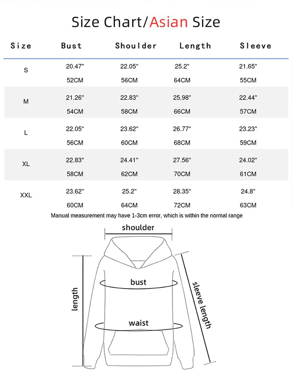 Size: This size is an asian size so please compare our size details with yours and allow a 1 - 3 cm difference due to manual measurement.