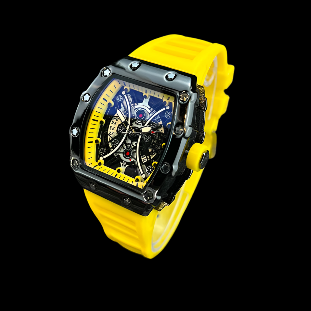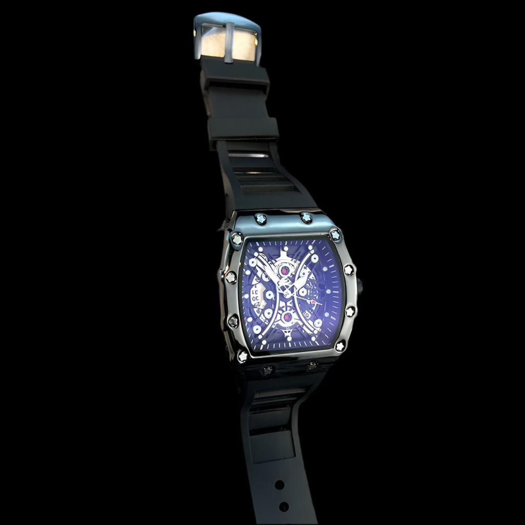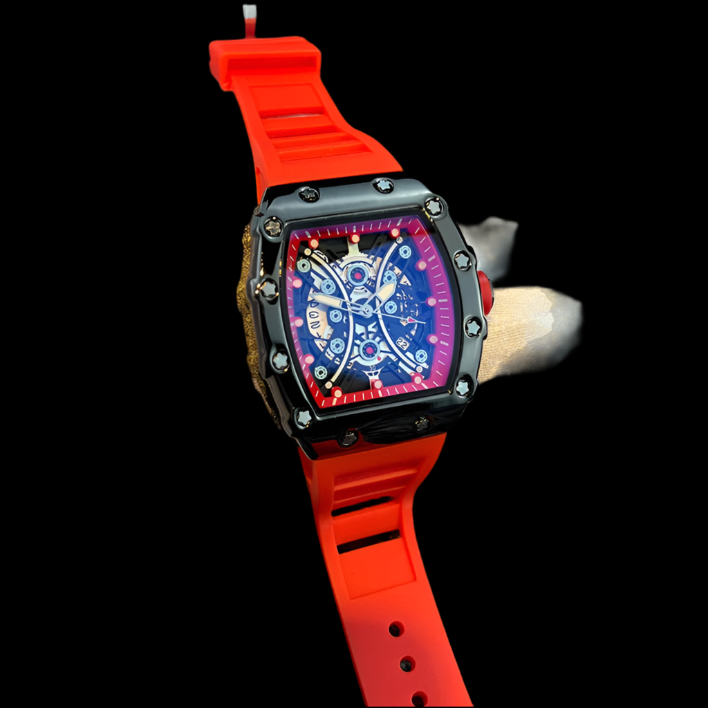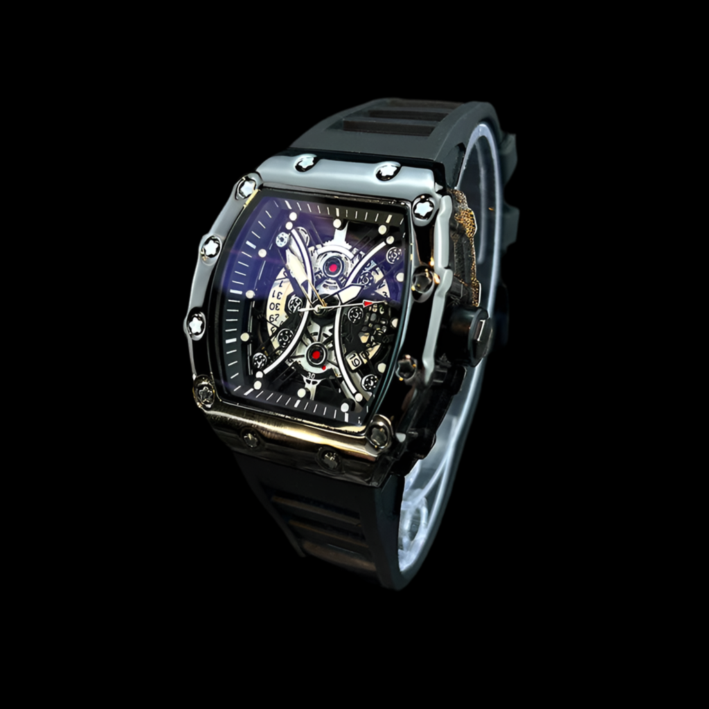 Stand Out in Style – A Barrel-Dial Sports Watch with Luminous Detail and Sleek Calendar Functionality.