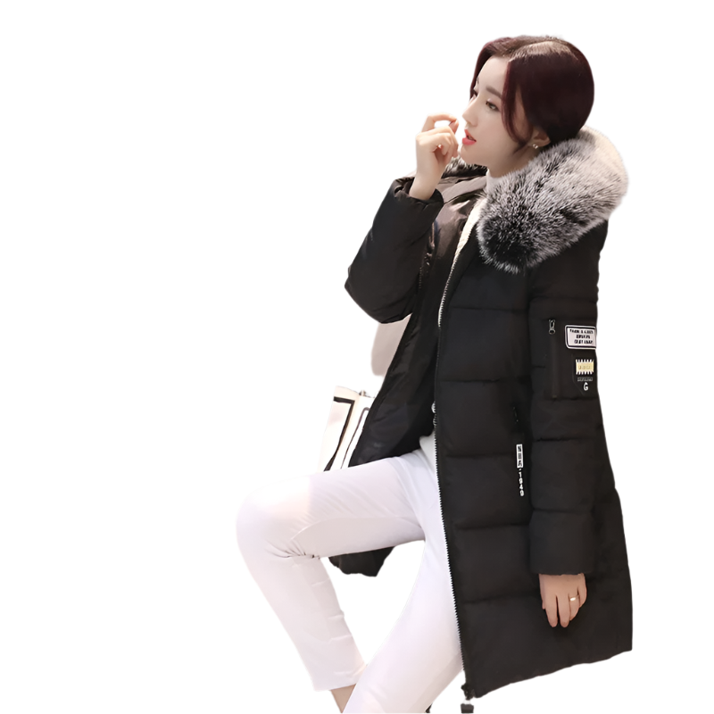 Stay Warm in Style - A Slim Fur-Collar Parka with Letter Patches and Elegant Detailing for Winter-Ready Fashion
