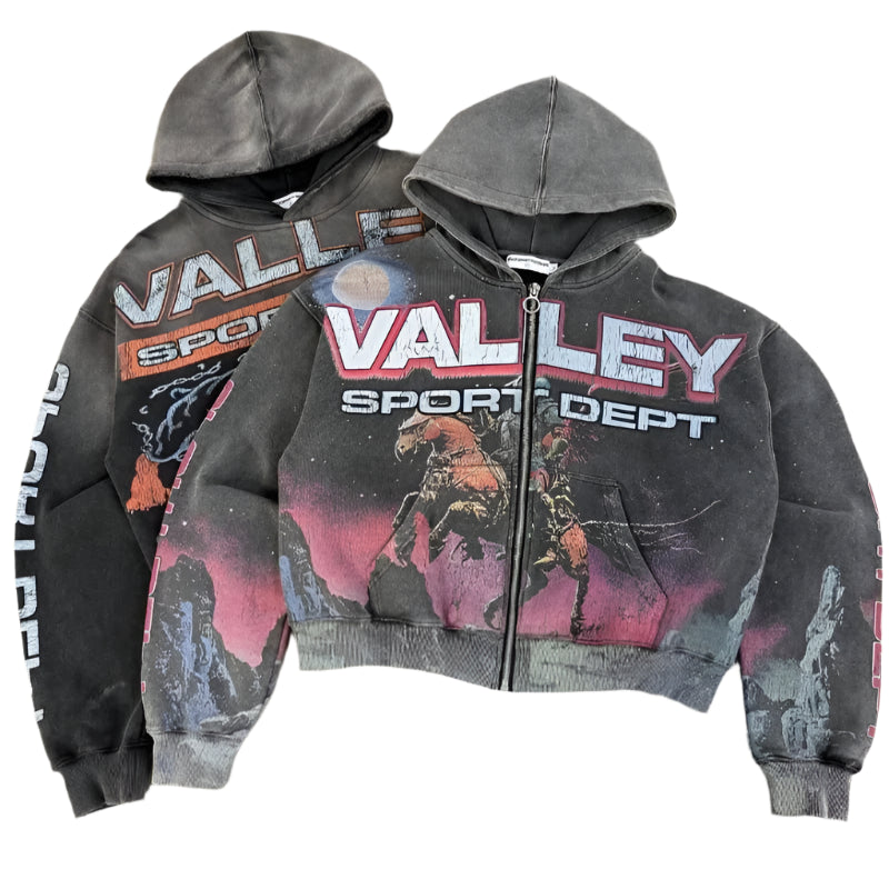 Grime Meets Grind - A washed letter-print zip hoodie fusing Y2K edge with high street style